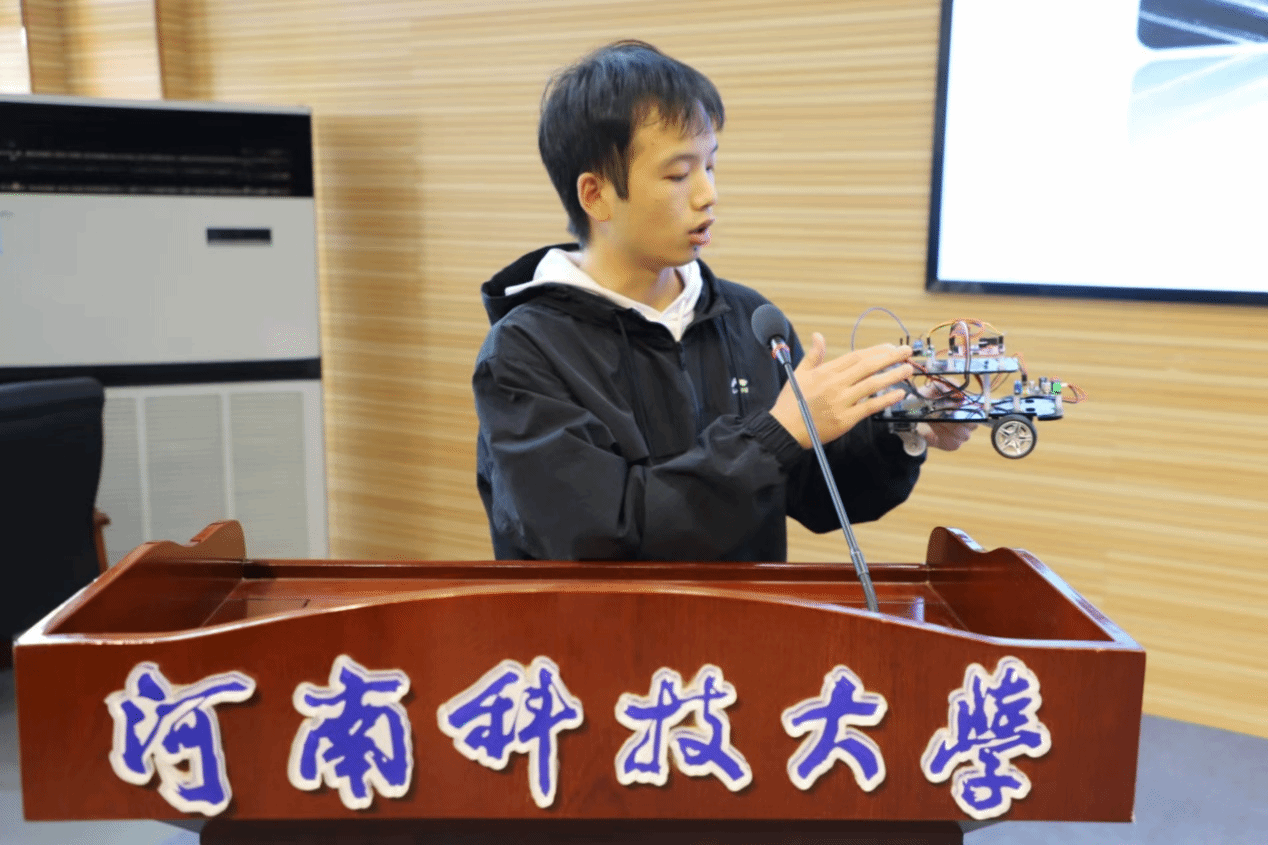 “数智中原”电子设计大赛优秀作品展示环节,电气231班郝鹏杰为同学们讲解了智能循线小车的运行原理和程序编写,并对各位老师的指导表示感谢。最后,电气231班的原金康向同学们宣传机器人社团,对“蓝桥杯”大赛、“数智中原”电子设计大赛作了一个简单介绍,希望同学们培养兴趣,踊跃参赛。