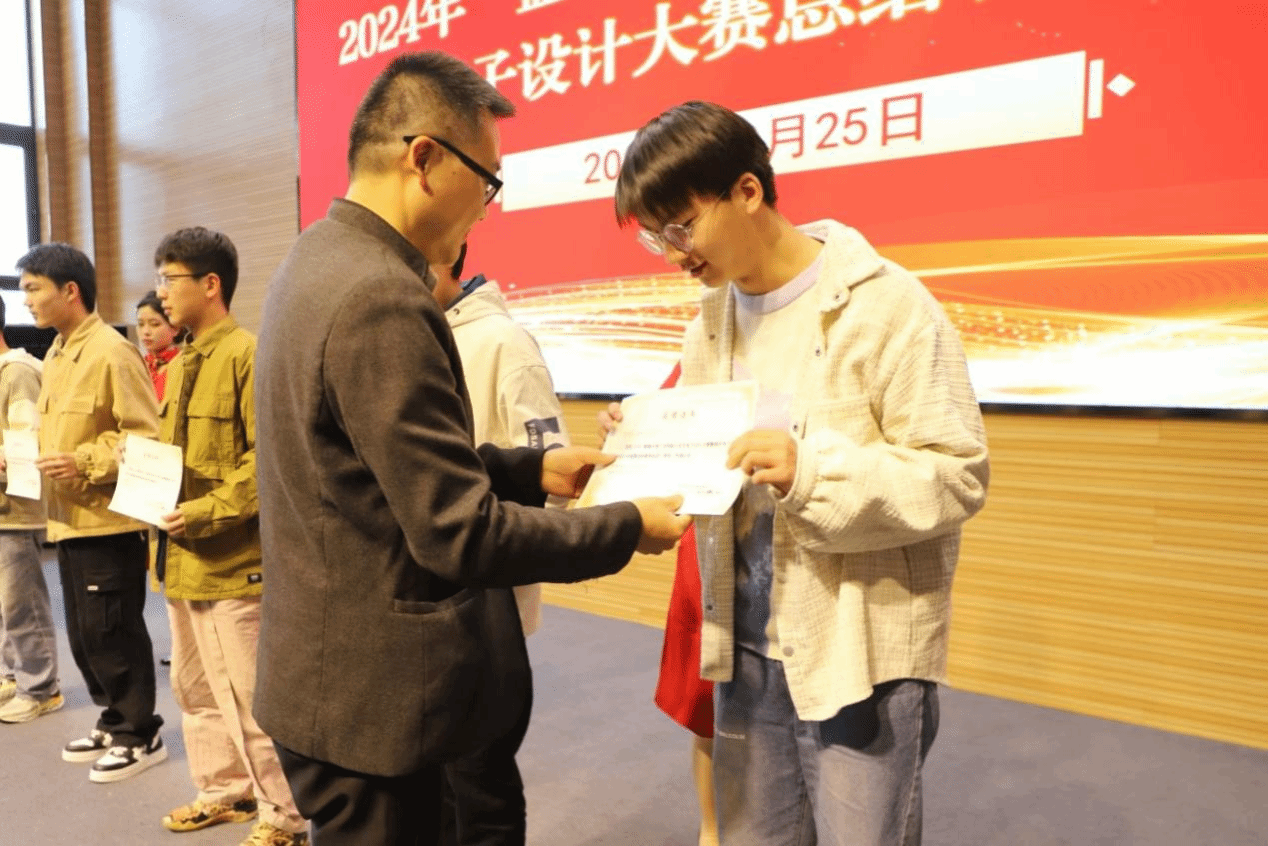 大会伊始,胡三宁宣读我院2024年“蓝桥杯”大赛、“数智中原”电子设计大赛获奖同学名单,对获奖同学表示祝贺,对在背后默默奉献的老师们表示感谢。他肯定了参赛同学的辛勤付出,希望参赛同学在接下来的时光里再接再厉,继续努力,也希望没有参赛的同学积极参赛,在竞赛中对相关学科知识进行深入、系统的学习。随后,胡三宁、尤向阳分别为“蓝桥杯”、 “数智中原”电子设计大赛获奖同学颁发奖项。