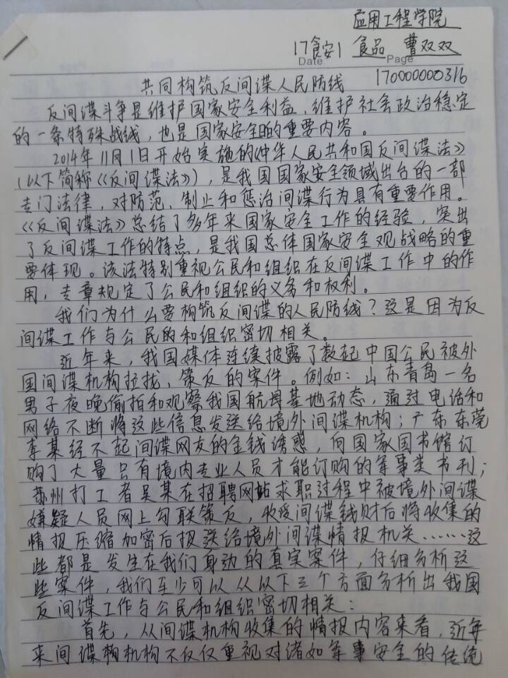 院部学生科、团总支、办公室利用周四下午和晚自习时间,通过组织开展国家安全主题班会、征文比赛、演讲比赛等活动,组织师生学习《中华人民共和国安全法》、《中华人民共和国反间谍法》、《中华人民共和国国家情报法》等法律法规,以及习近平关于国家安全的重要论、随后组织观看反间谍宣传视频。