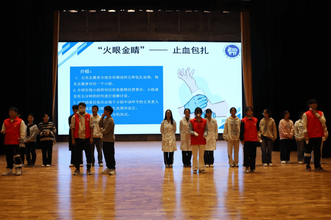 本环节主要考察选手的观察能力和止血包扎的处理能力。比赛过程中,选手们沉着冷静,密切关注着志愿者的处理动作,最后由各队主负责人指出他们止血包扎的错误操作,并对其做出正确示范,展示出扎实的急救知识。