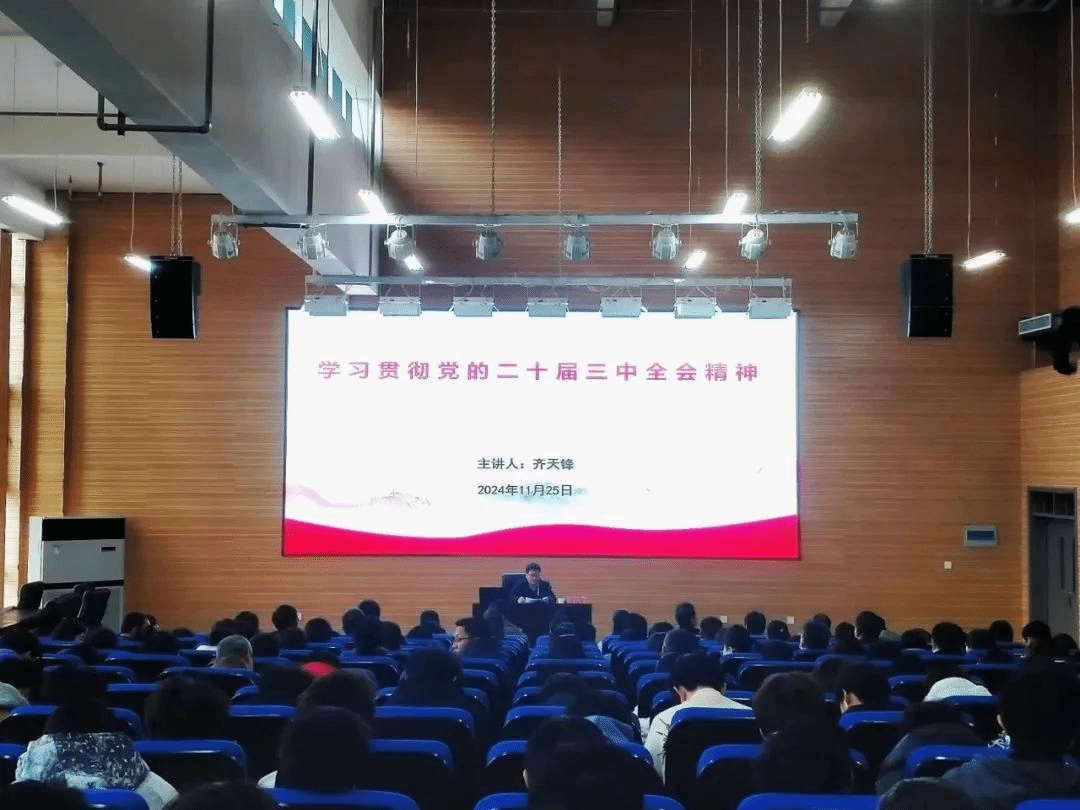 齐天锋围绕党的二十届三中全会精神为师生们开展主题党课培训。首先,他强调了学习党的二十届三中全会精神的重大意义,并阐明全会的关键词是“进一步全面深化改革”,为中国式现代化提供了制度保障、强大动力。其次,他从历史、现实、改革的角度进行分析,点明全会的主题是紧紧围绕推进中国式现代化,进一步全面深化改革,调整生产关系,解放和发展生产力,重点促进新质生产力的发展。
